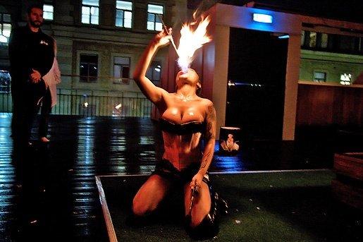 De här är alltså två sjukt erfarna och professionella tjejer, med större vilja att äta och spruta eld till rockmusik eller andra evenemang än att bära kläder, (för de hatar kläder tydligen tror jag, därför att jag har aldrig sett dem med många plagg på.) Nu hörde jag precis att de börjat ta emot bokningar igen inför sommarsäsongen! Whohoo! Är ni intresserade – ring och boka dem på 0733 738 738, eller via https://www.facebook.com/NocturnalAgency. Här en bild på Sarah när hon indränkt i brandfarlig olja slukar eld på min fotoutställning på Push i Göteborg. (Den ska jag berätta mer om senare).