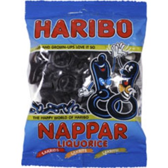 Nummer 3: Haribos lakritsnappar. Sö löjliga. Så löjligt goda. Denna vinner mer på sötman än sältan. Men jag kan svulla i mig dessa till dödsdagar. Förbannat himmelska!