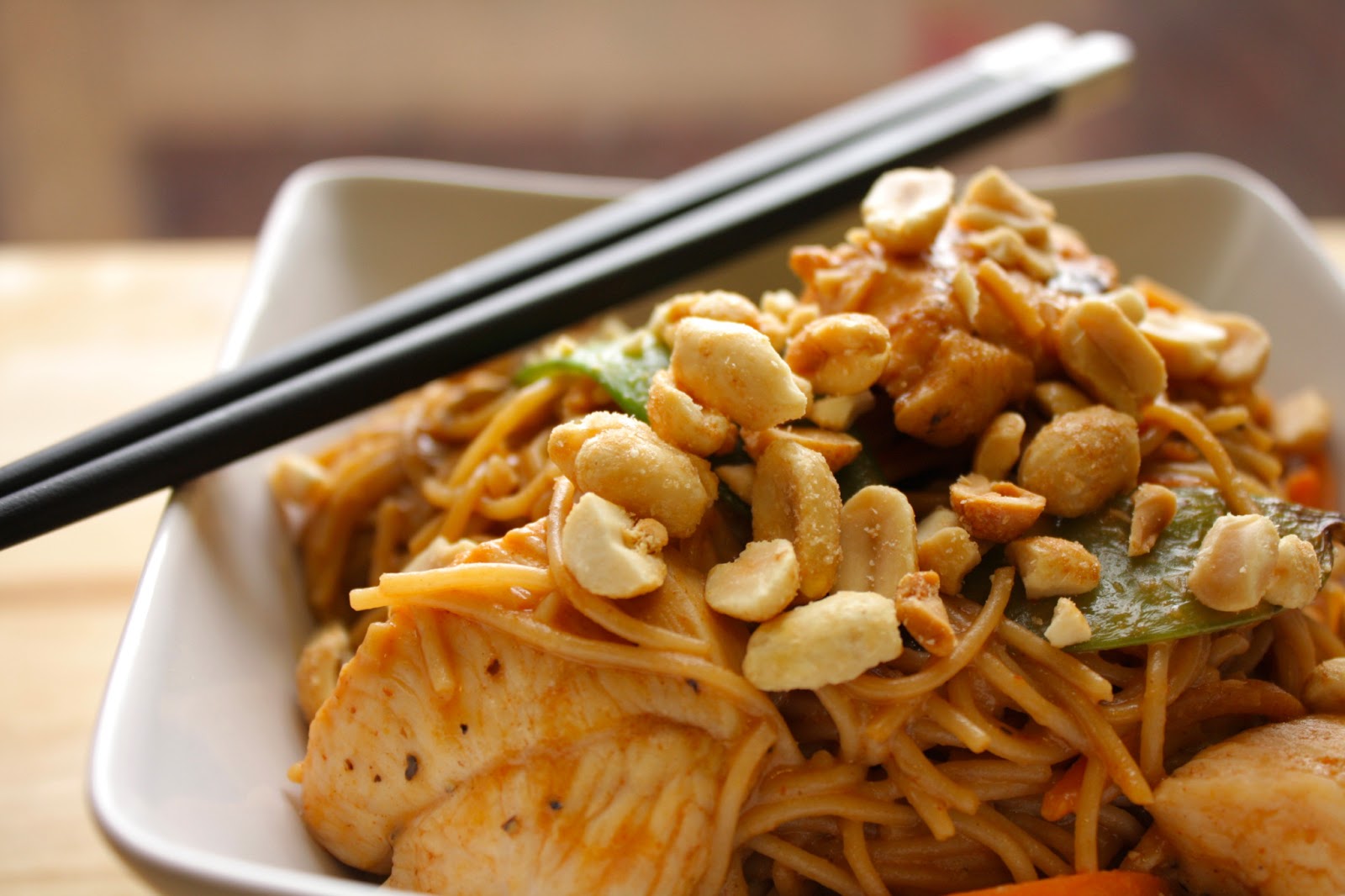 Choppa upp en kycklingfilé och stek först på het värme så den får en rivig stekyta och härlig färg, dra sen ner på värmen, krydda med svartpeppar, chilipeppar, basilika (helst färsk) och en pressad vitlöksklyfta, två matskedar soya och langa i en halv näve saltade jordnötter. (vill man få lite färg på skapelsen kan man choppa i lite färsk parprika med, rekommenderar röd om du vill vara nyttig eller gul om du vill ha lite söt balans, grönt är för beskt.)