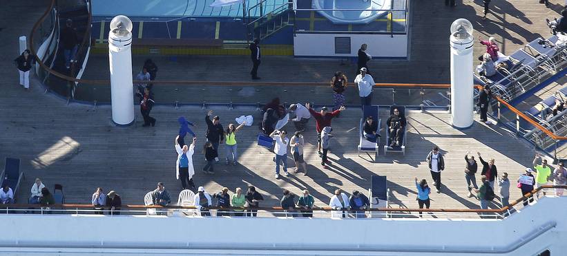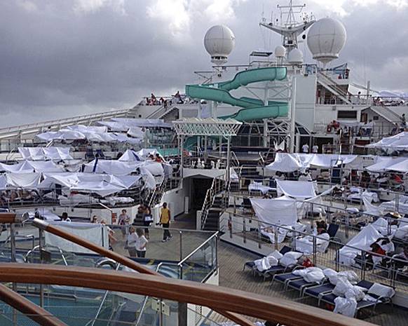 Skeppet har 3000 passagerare, som måste göra sina behov varje dag i snart en vecka i ej fungerande toaletter. Sen får vi inte glömma att det är ytterligare 1000 personer i besättningen som ska få detta att fungera. Poor Housekeepers. Dessutom börjar all mat och dryck ta slut så nu slåss folk bokstavligen om maten som är kvar, de tältar på däck för att kunna andas och hänger ut lakan med SOS-signaler.
