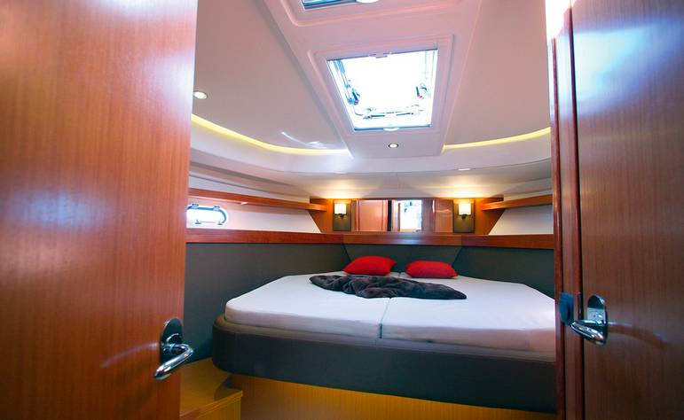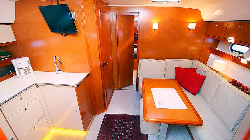 Vi imponerades av hur rymliga de två akterhytterna är med bland annat full ståhöjd. Enda nackdelen är att man måste gå igenom salongen för att gå på toa. Även för salongen måste vi berömma Bavaria för att ha skapat bra svängrum. Men vi avråder från att välja den mörka träinredningen. Välj ljust och rymdkänslan blir som natt och dag. Här skulle tyskarna kunnat lära lite av sina konkurrenter som skapat mer ljusinsläpp, bland annat genom att glaslägga delar av instrumentpanelen. Något Bavaria faktiskt gjort i sin nya 31-fotare.
