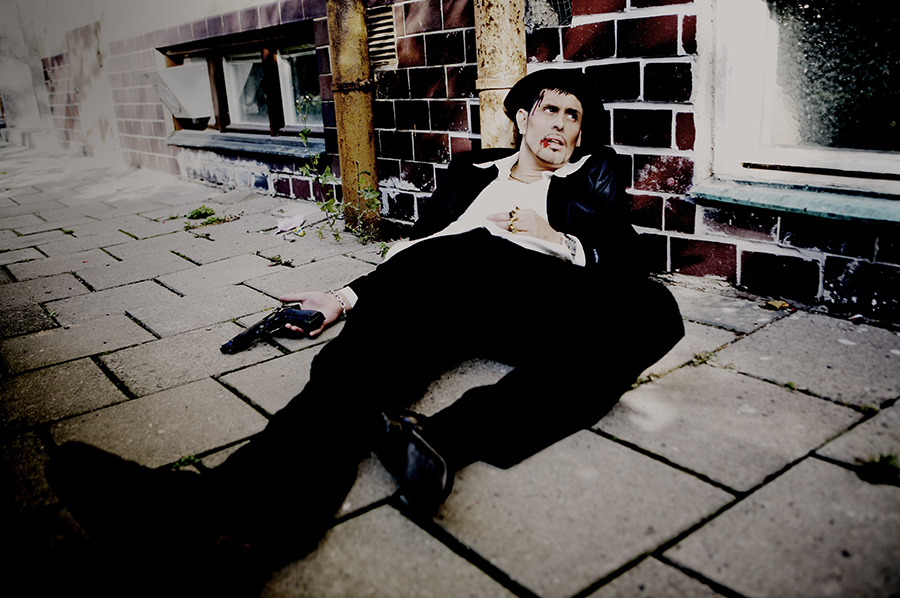 Jag hade bett han att ta med sig två saker. En snygg kostym och en pistol, alltså en replika eller leksakspistol, rättare sagt, men jag tror han kom med en äkta, den var tung som fan nämligen(!), och kostymen såg ut som den dyraste som någonsin sett Alby’s ljus. Vi började plåta i studion men fick inte till känslan så vi gick ut i en risig gränd och jag bad honom att lägga sig ner i smutsen som om han blivit nerskjuten i en maffiauppgörelse, och som det proffs som han är, gör han det och jag får till världen klockrenaste bild!