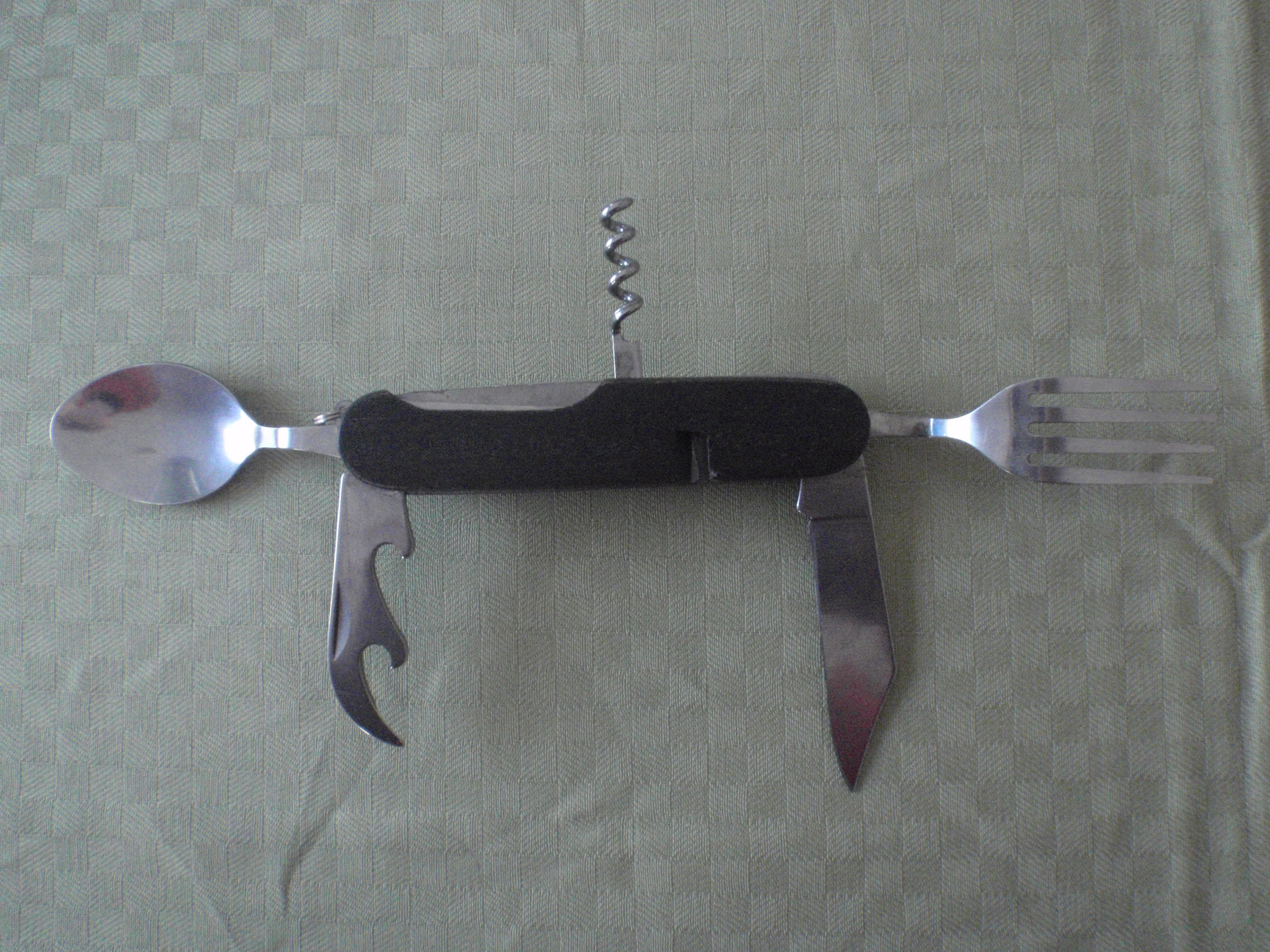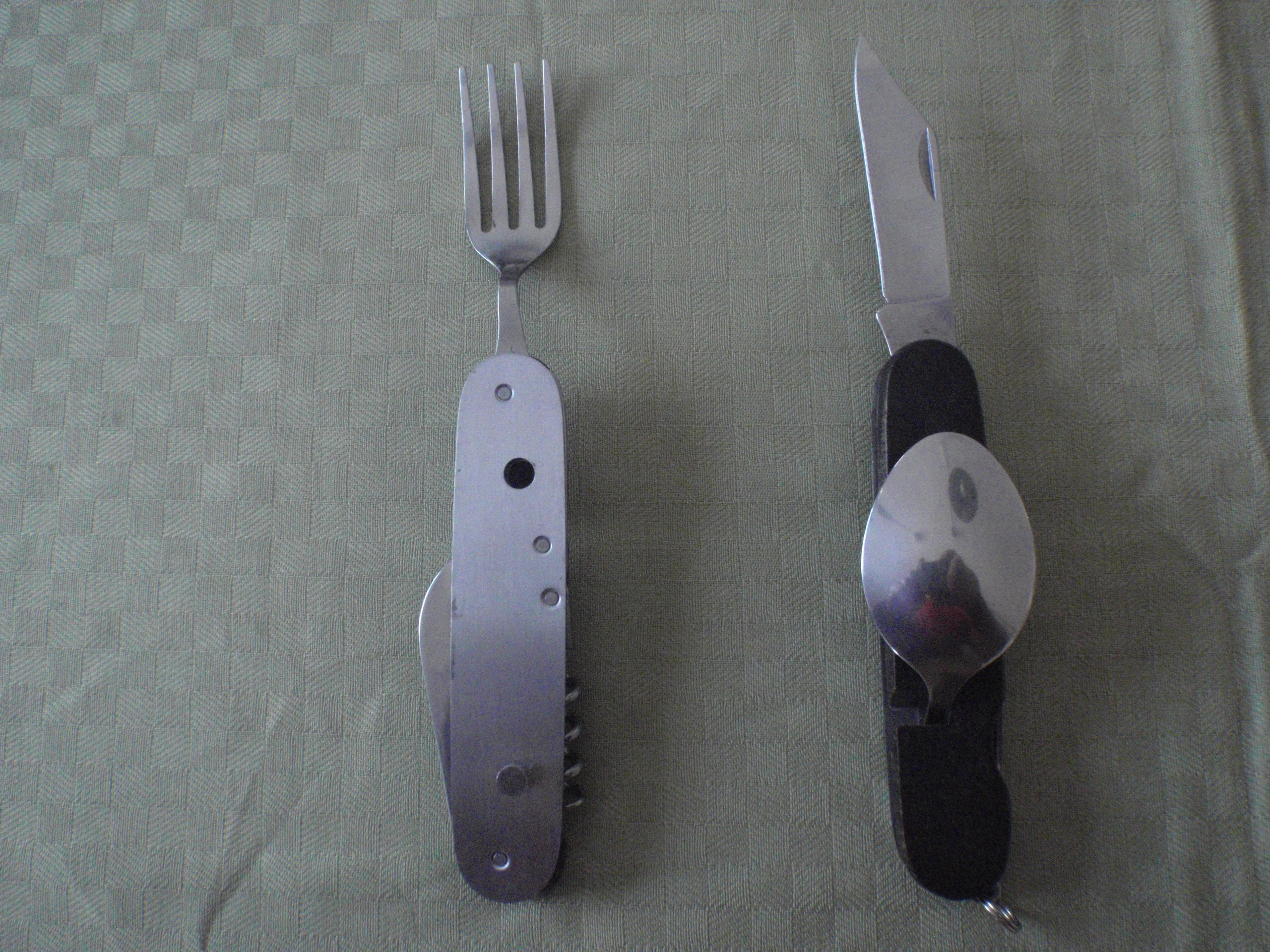 Ett Multipelverktyg i rostfritt stål och trä med kniv, korkskruv, flasköppnare, konservöppnare gaffel och sked. Verktyget kan tas isär så att man får ett i varje hand när man äter.