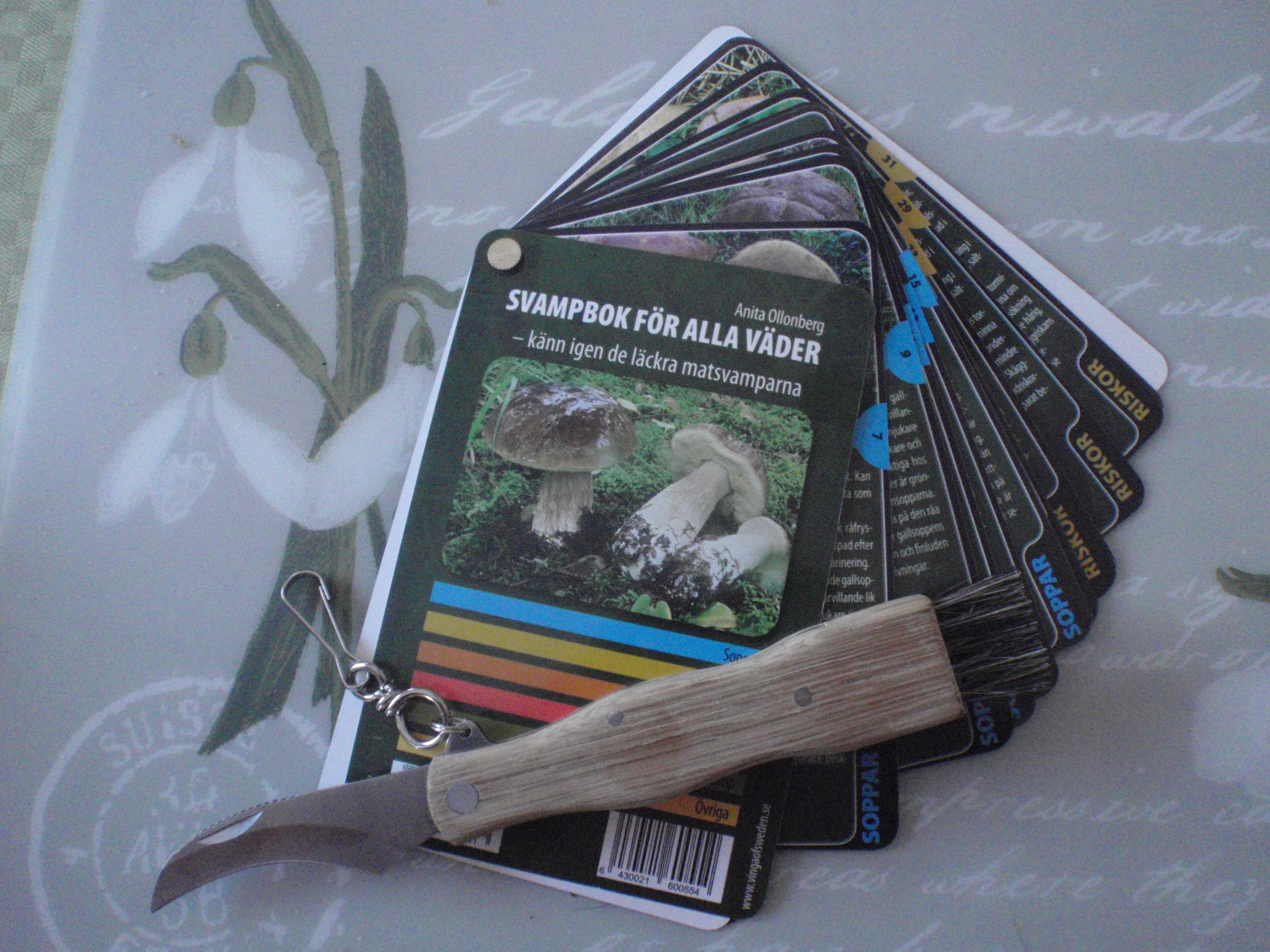 Ett svampset bestående av en nätkasse med tre fack för olika svampsorter, en mycket bra svampkniv med borste samt en svampbok med hårdplastade sidor så att man kan ha den med sig i alla väder. Sidorna har bilder på båda sidor
