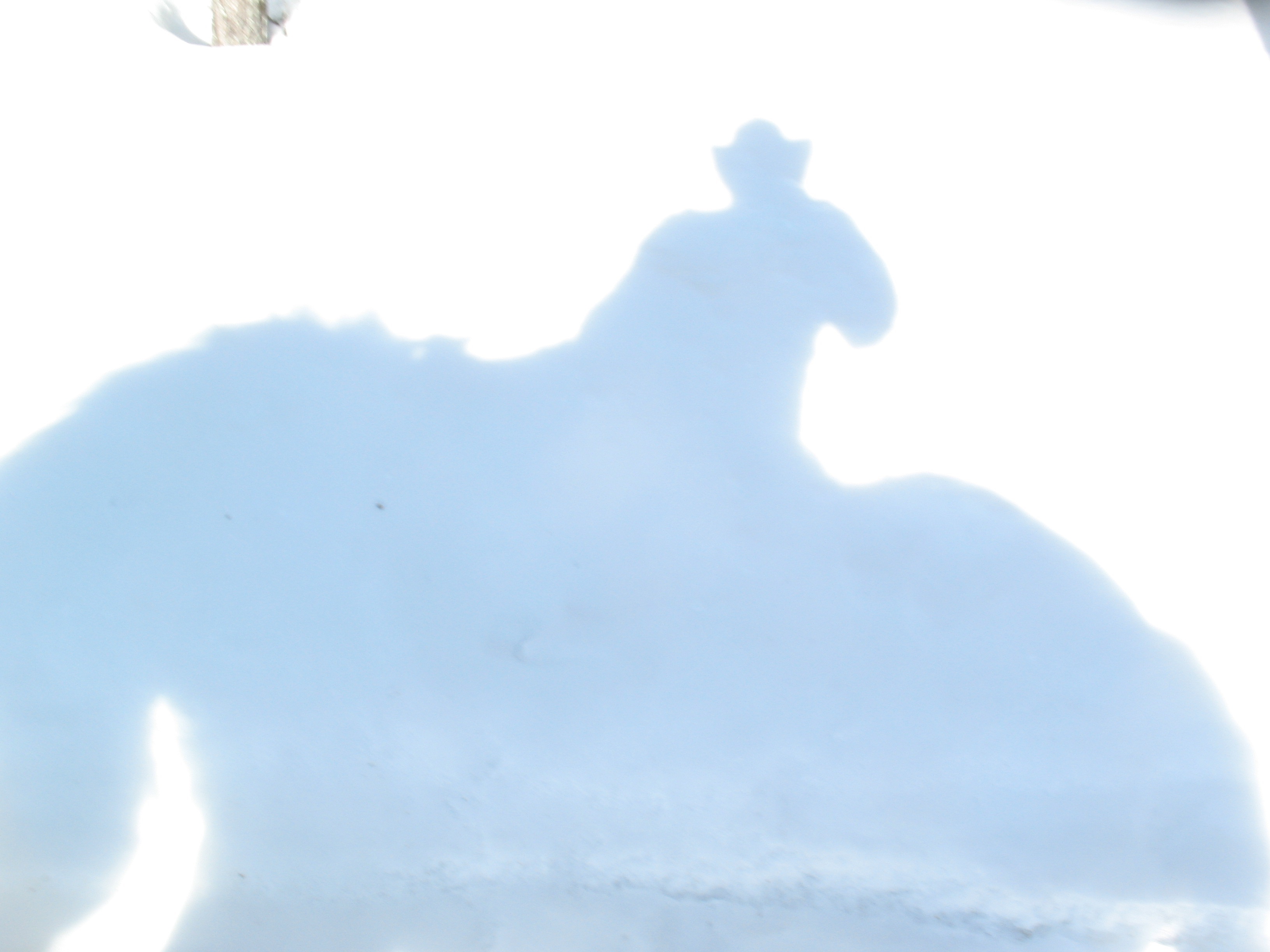 Under några år, rätt nyligt, hade vi tre hästar och eftersom vi bodde ute i skogen var det i sådan terräng vi red. Våra hästar gick ute hela året, inga täcken, ingen värme i boxarna som vi bara använde när hästarna skulle vila efter långa ridturer i skiftande terräng och temperaturer. På vintrarna kunde det vara så mycket snö att våra fötter ritade spår vid sidan om hästarnas. Vi stötte på älgar som inte blev rädda eftersom dom såg häst/ryttare som en enhet. Vi plockad svamp från hästryggen. man får bra överblick och min häst stod alltid still och väntade på mig medan jag grovrensade svampen. Jag räddade min häst när den gått genom isen på ån nedanför huset. -20 grader och jag hoppade i med ett rep och simmade under hästen som tyvärr trängde sig mot iskanten så att jag inte kunde komma upp på den sidan. jag drog i mig massor av lerigt vatten, men tog mig upp. Jag gjorde en ögla runt halsen på hästen och tog mig upp till huset, klädde av mig, duschade hett, torra kläder, ett paket hårdbröd och en hink havre och sedan ner till hästen efter att jag ringt räddningstjänsten. Jag låg på knä i vattnet bredvid min häst och matade den med hårdbröd och havre för att den skulle hålla kylan borta något så när. Efter ett par timmar kom en brandbil med åtta män. De fick krypa genom en skogsdunge i snön som var nästan meterdjup. De hade med sig en stång som såg ut som een stor metkrok med en tvärslå i överändan. Vi knöt ett band i kroken och jag fick föra den under hästen och upp på andra sidan. Så fäste vi en bred textilrem -som en brandslang, och drog den under hästen. Nu jobbade vi i drygt en timme med att försöka dra upp hästen. Tji! En man kröp tillbaka till brandbilen och kom tillbaa med en motorsåg. han sågade en kanal från strömfåran och in mot land och jag lyckades få hästen att gå in i den. Tyvärr var det djupt även där. Hästen var blodig under frambenen efter att ha försökt komma upp. Efter ytterligar en halv timme lyckades vi häva upp den så mycket att ett bakben kom upp ur vattnet. Den sparkade med det och vi fick upp den på isen. jagf hade mitt rep runt halsen på hästen. den stegrade sig så all flög åt sidorna och så sprnag den med mig hängande under upp mot stallet. Jag blev inte skadad. När den kom upp stod den med benen ut åt sidorna och Snarkade! Jag tog in den i en box, torkade av det jag kunde, satte på dubbla svettäcken, bar dit en kupévärmare och sedan for jag till Piteå och sjöng. Jag lyckades genomföra jobbet, men på hemvägen tappade jag rösten. Jag fick lunginflammation. Det dröjde ett år innan jag kunde sjunga Gamle Svarten och En sliten grimma eftersom jag fick en klump i halsen och tårar i ögonen när jag tänkte på att hästen kunde ha dött! Min fru sade att jag inte är riktigt klok som riskerar mitt liv för ett djur. Det här djuret var min bäste vän!!! Jag skulle göra om det, en del av er skulle nog också göra det. Bilden är en skugga i snön av mig på min häst…