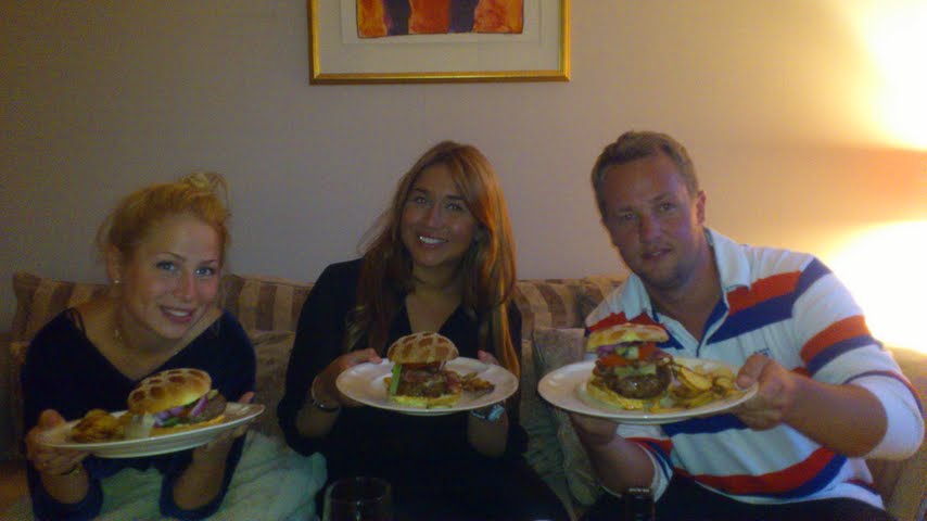 Sedan blev det en liten par middag. Min flickvän Felicia och Mattias flickvän Frida. Brukar ju skämta att jag tycker det är patetiskt att folk lägger upp bilder på vad dom äter. Här kommer i alla fall en bild på de otroligt goda hemma gjorda hamburgarna Mattias och jag lagade till 🙂