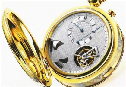 Franska Breguet grundades 1775 och är en av världens mest legendariska urmakare. Denna modell är ett klassiskt fickur i 18 karat gult guld med handgjort urverk och dubbelriktade roterande urtavlor. Priset på 5,3 miljoner svenska kronor gör den till listans billigaste.